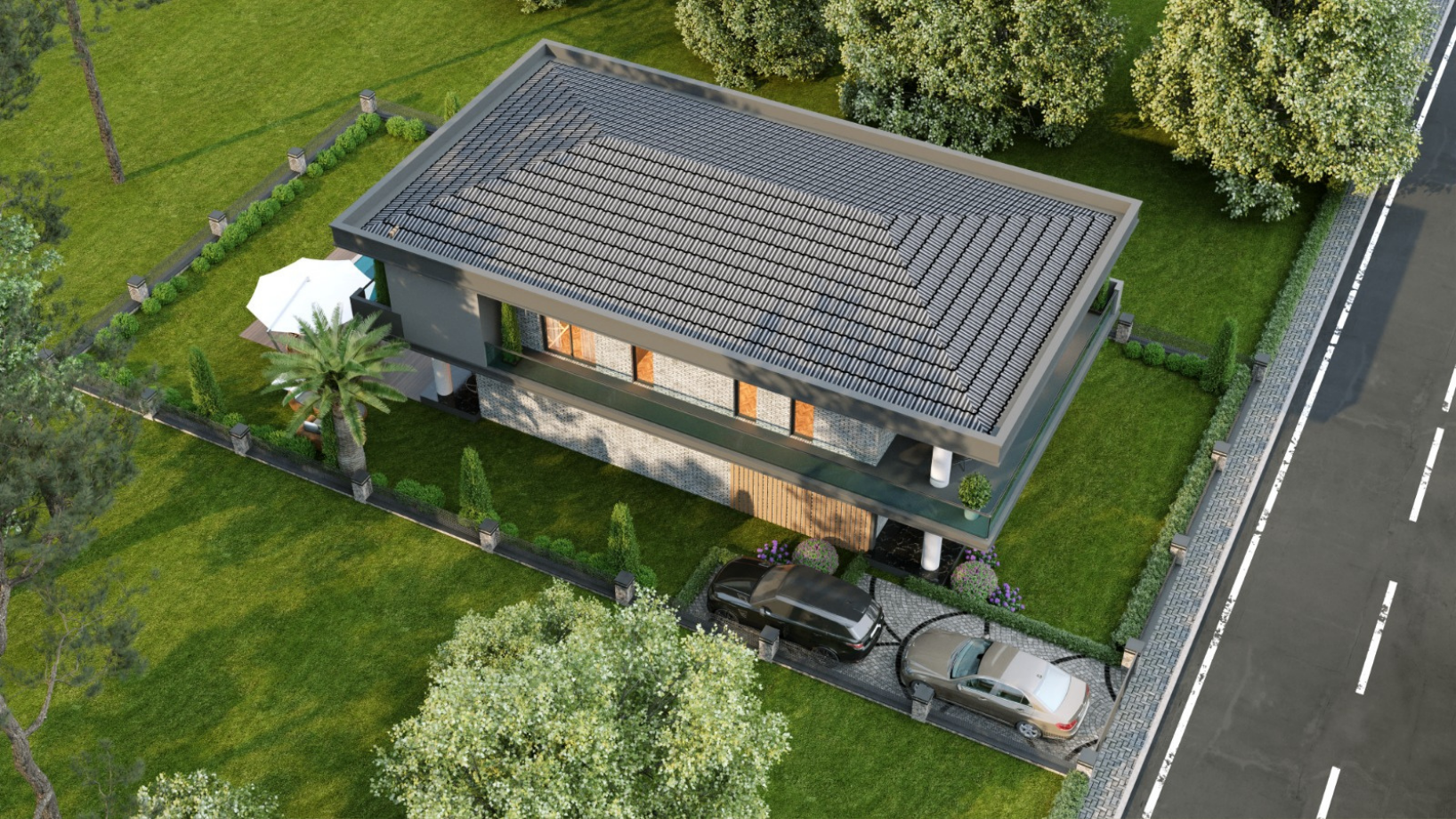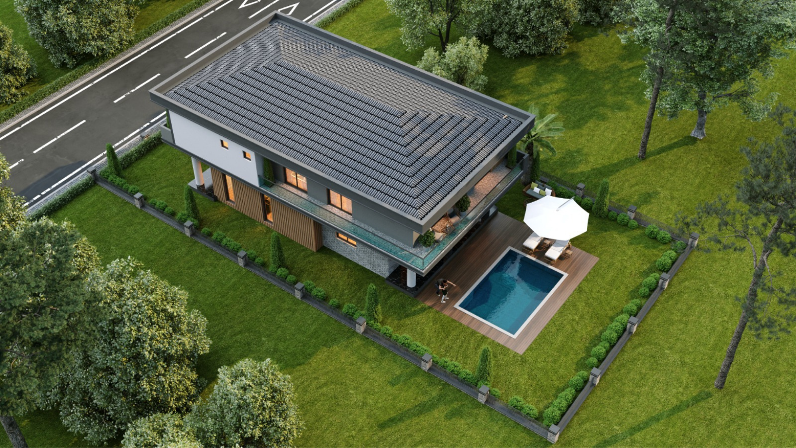 Peyzaj düzenlemesiyle desteklenen geniş bahçe alanı, doğayla iç içe huzurlu bir yaşam sunmaktadır. Araç giriş çıkışlarını kolaylaştıran modern otopark bölümü, güvenlikli çit sistemi ve doğal taş detayları proje bütünlüğünü tamamlamaktadır. Villamız; şehir merkezine yakın, ancak gürültüden uzak konumuyla hem sakinlik hem de ulaşılabilirlik açısından ideal bir denge sunar.